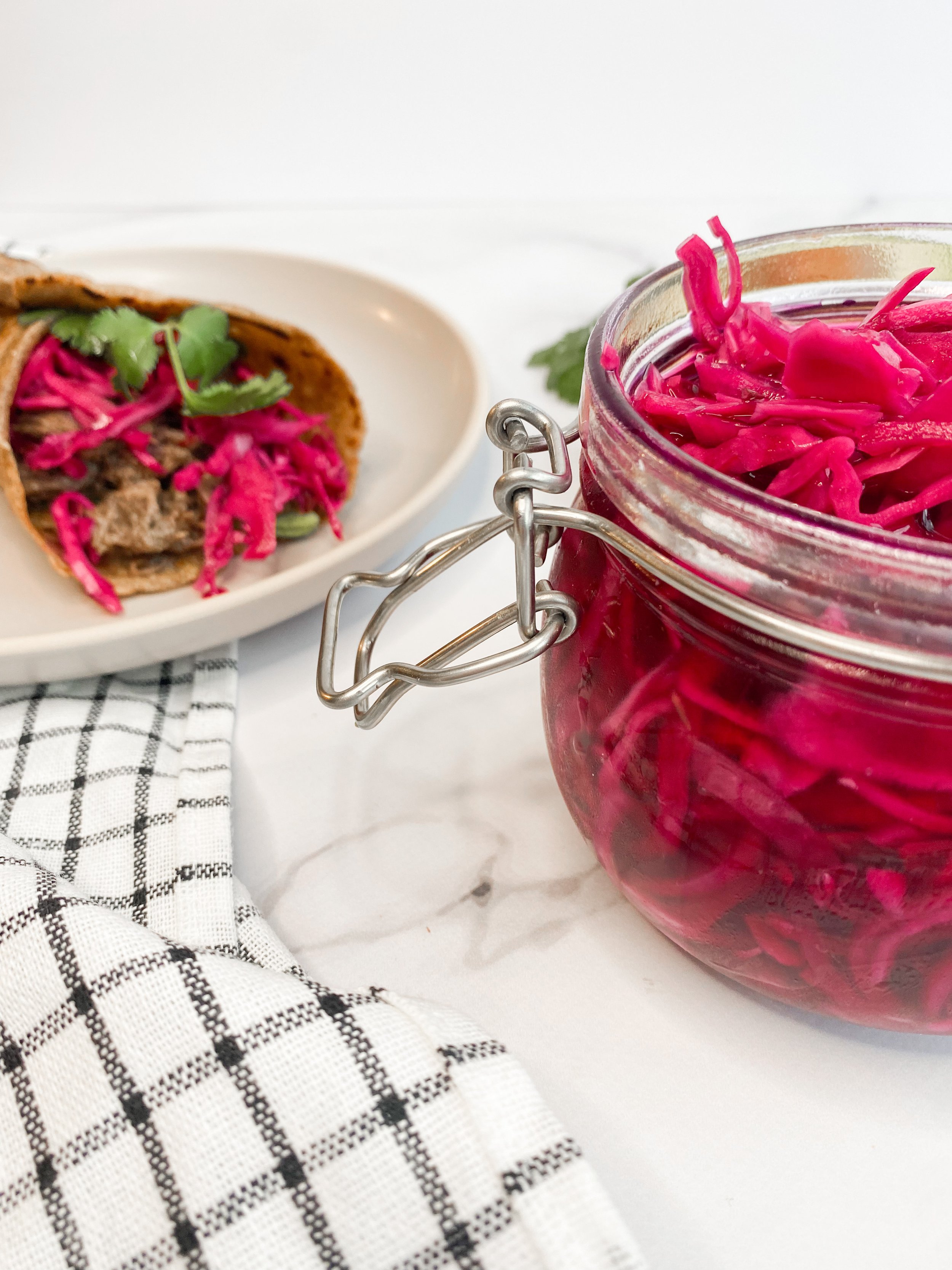 My favourite way to eat these pickled cabbage is on top of a salad, but the options are endless really. On top of poached eggs, in a wrap, I mean, you name it! Anything that could add an extra zing and crunch would go well with these!