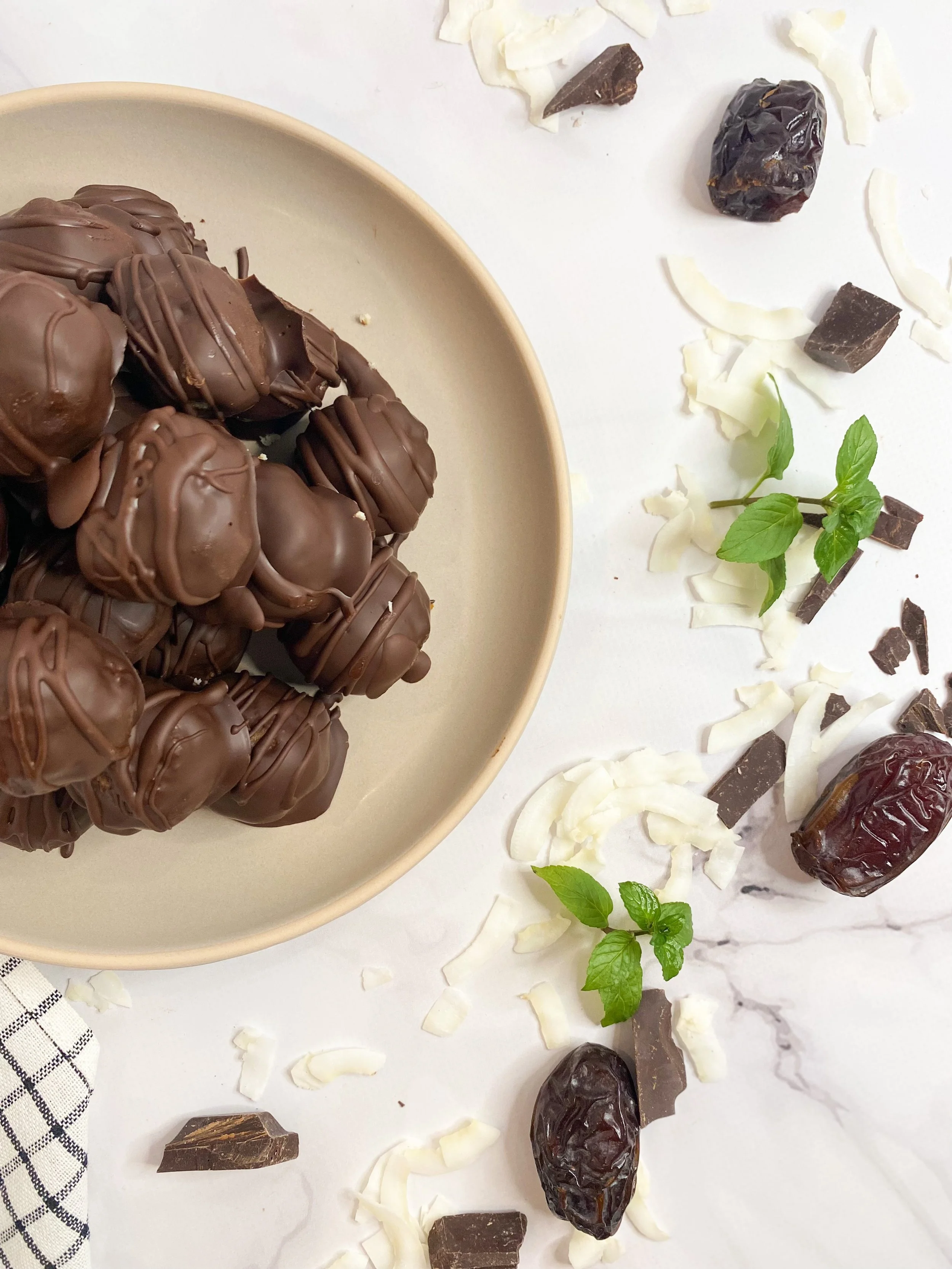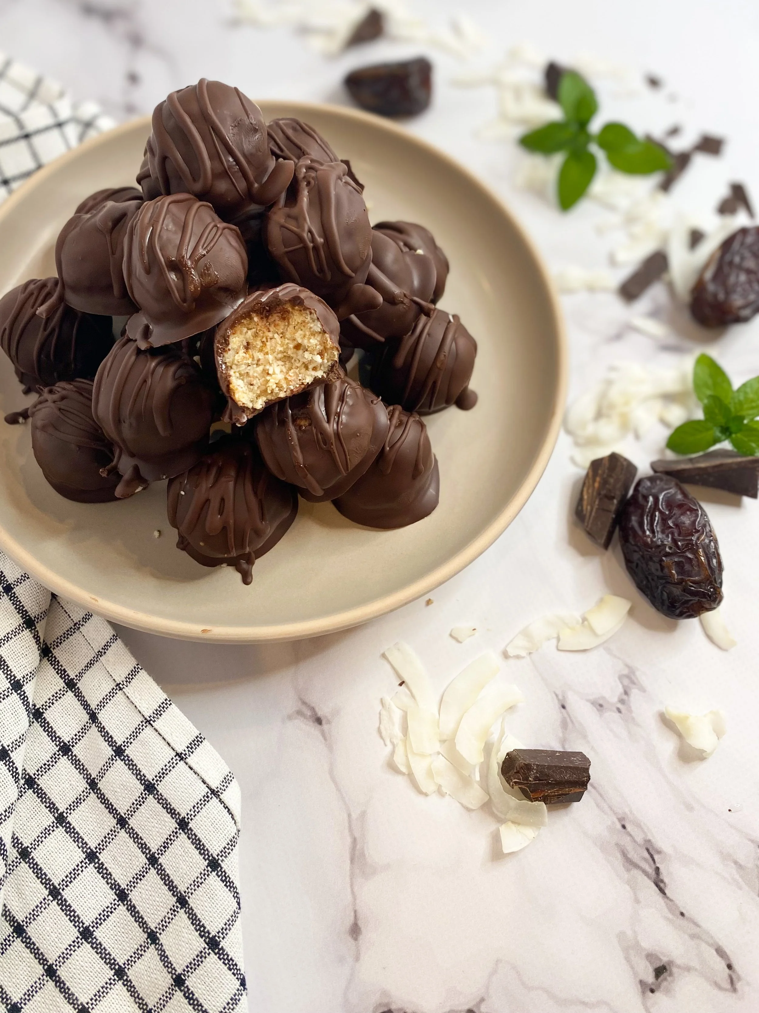 - Top each ball with additional coconut while the chocolate is still soft, then place in the fridge to harden