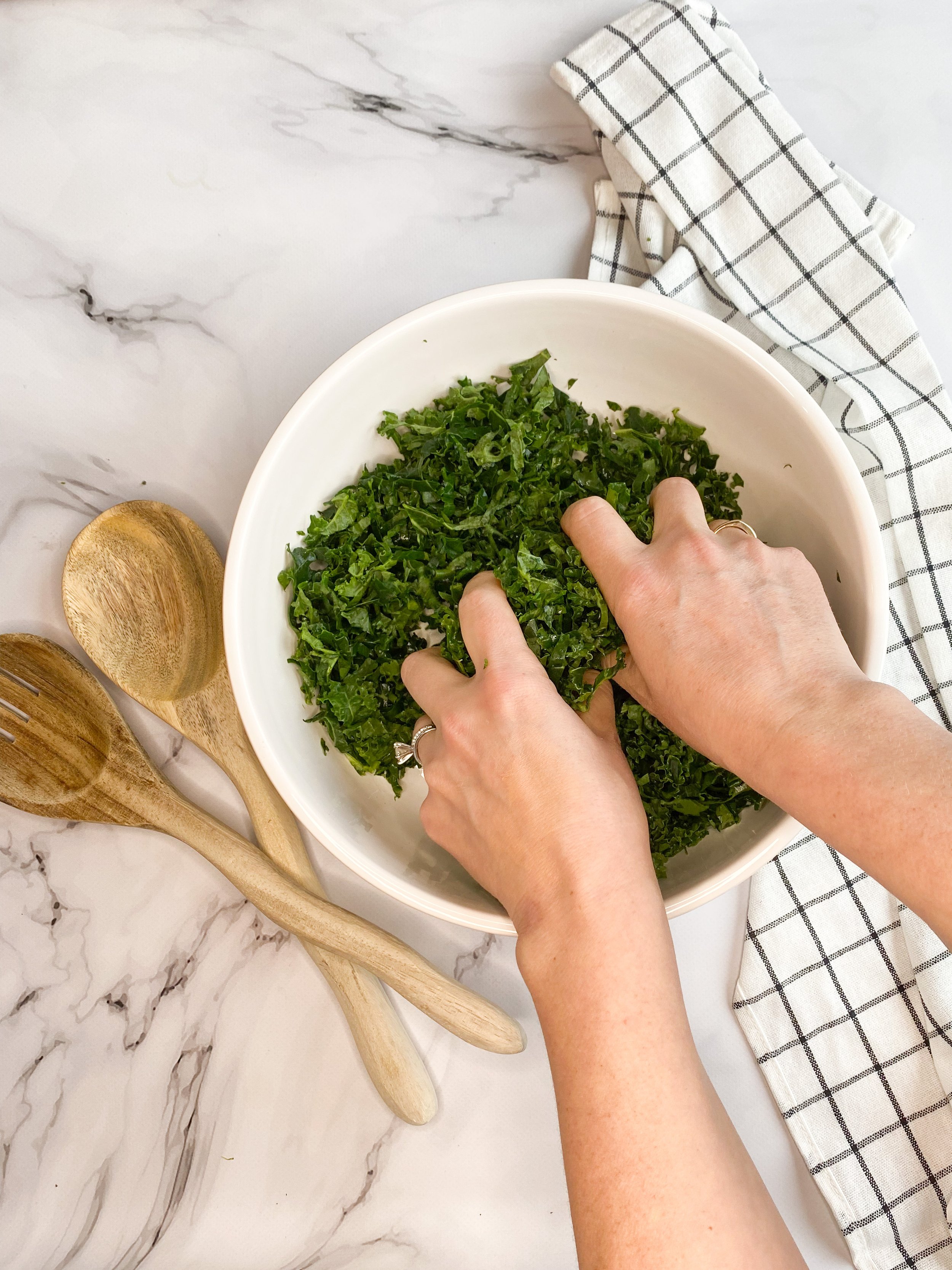 I massaged my kale with a bit of oil before adding the rest of the ingredients to the bowl. This helps to soften the kale and can take out a little bitterness as well I find.
